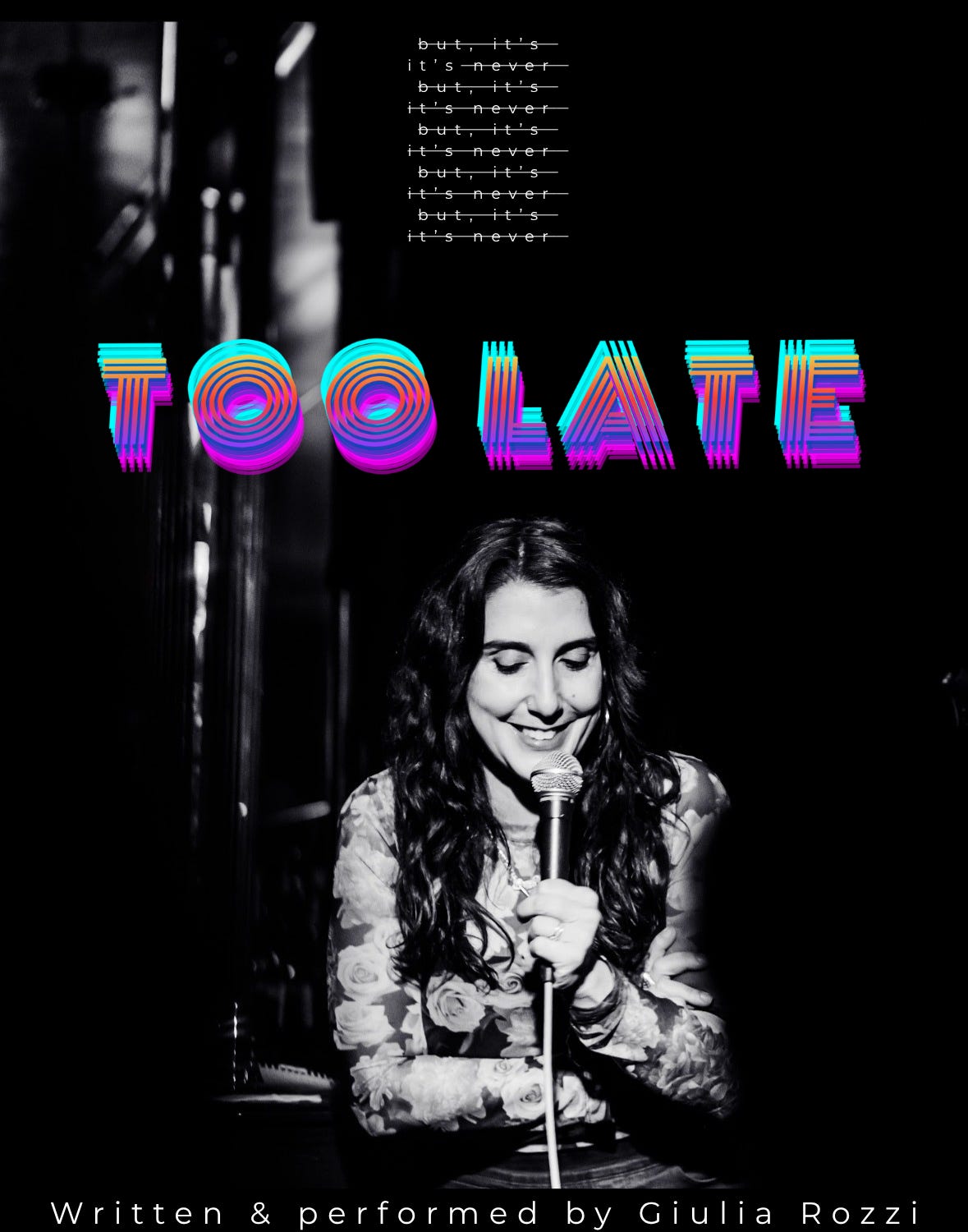 If you’d like me to come perform in your city, let me know! I’m just starting to brainstorm a lil’ tour of Too Late and would love to do the show in your theatre, club, or maybe even your backyard.